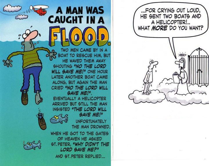 This joke can really make you laugh! This man had faith that God would rescue him but he was not seeing the opportunities that kept knocking on his door. He thought there was possibly something else to look for.
